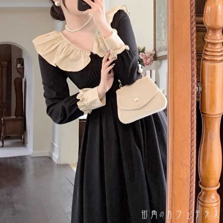 レディース ドレス パーティードレス ワンピース Aライン ミドル丈 ミディアム丈 スタイルアップ 体型カバー キュート レトロ カラー切り替え ギャザー 大人かわいい 上品 シンプル きれいめ 長袖 ブラック 黒 結婚式 2次会 お呼ばれ パーティー お食事会 ディナー ランチ