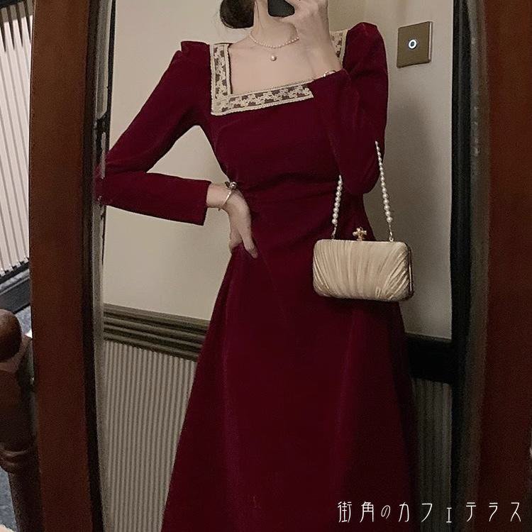 レディース ドレス パーティードレス ワンピース Aライン ロング丈 スクエアネック ふんわり袖 レース キュート レトロ シンプル きれいめ 上品 大人かわいい スタイルアップ 長袖 ワイン ブラック 黒 結婚式 2次会 お呼ばれ パーティー お食事会 ディナー ランチ お出かけ