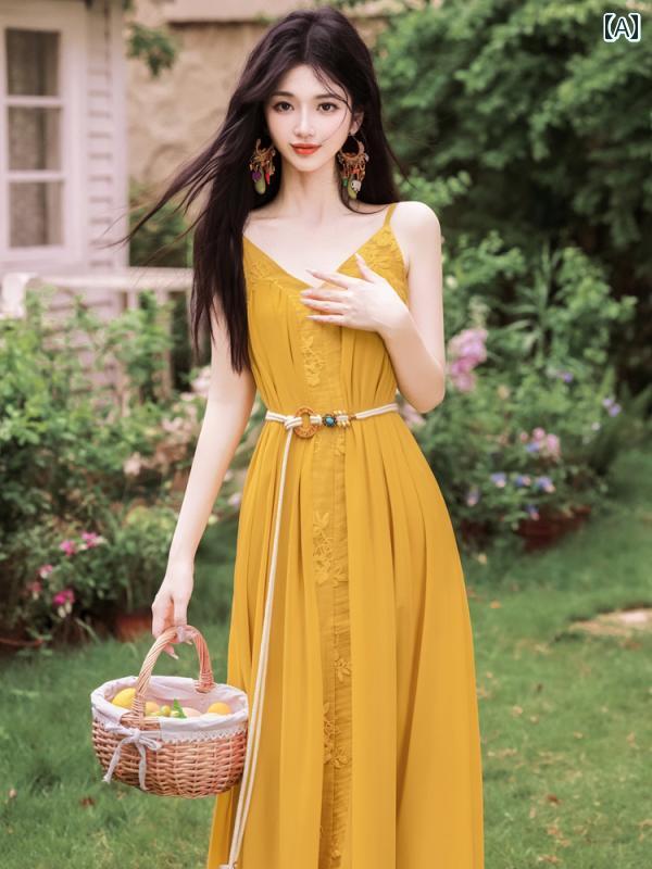 ワンホン スカート コットン ドレス 雲南 旅行 ボヘミアン ホリデー ビーチ イエロー スカート サスペンダー ドレス 女性 夏 スーツ 着用