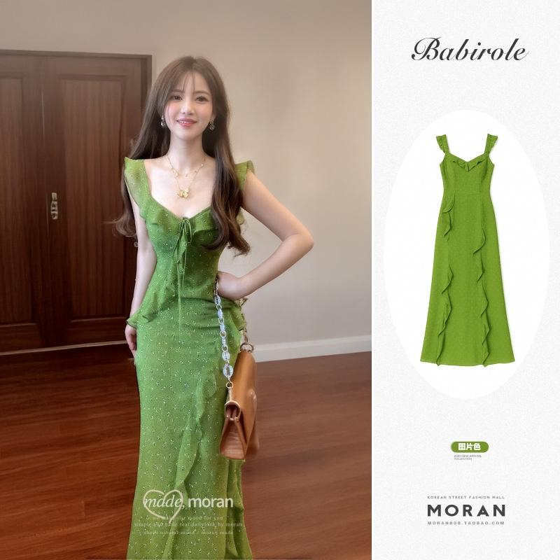 エレガント カラードレス ワンピース フレンチ ラッフル グリーン ホワイトフローラル サスペンダー ドレス レディース サマー 2025 ホリデー ビーチ