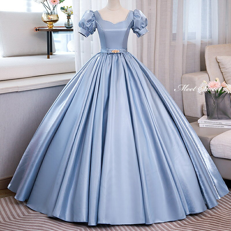 カラードレス プリンセスライン サテン パフスリーブ ブルー 半袖 ロングドレス ウェディングドレス 結婚式 二次会 花嫁 前撮り 演奏会 発表会 ステージ衣装 ウエディングドレス パーティードレス ブライダル 大人 舞台 演出 イブニングドレス コンサート コンクール