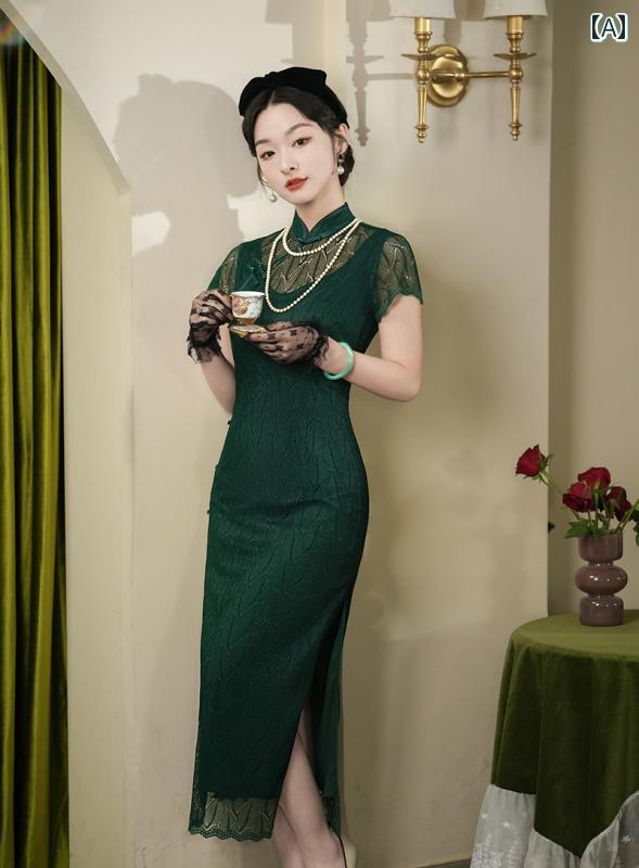 レディース チャイナドレス ロング 半袖 メッシュ レース 透け感 グリーン エレガント 斜めラベル 立ち襟 パーティー フォーマル スリム スリット ジャカード シック 高級感 クラシック