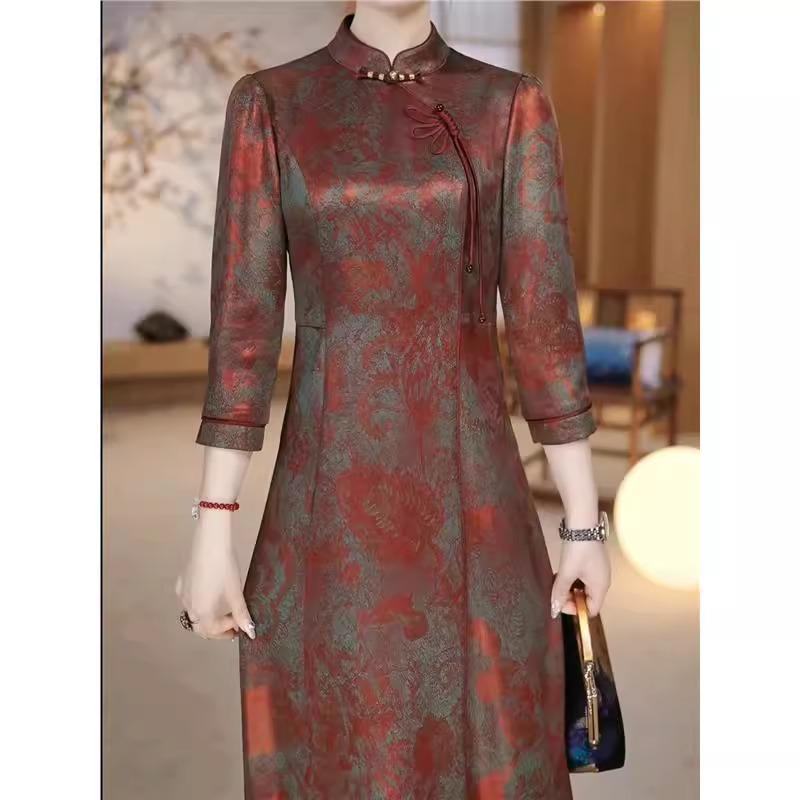 レディース チャイナドレス 半袖 中華風 ミディ丈 深緑 ブロンズレッド フレア ぼかし フローラル 立ち襟 斜めラベル スリミング エレガント シック おしゃれ スタイリッシュ