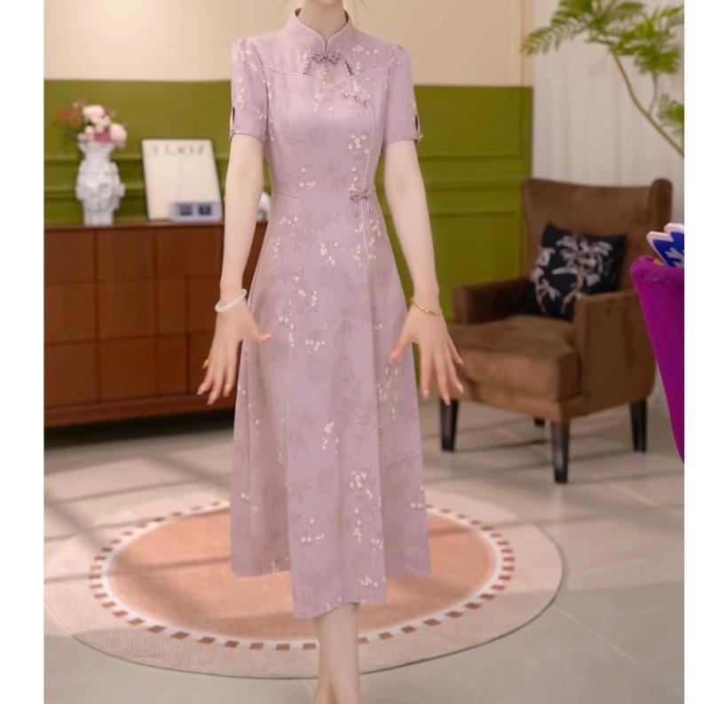 レディース チャイナドレス 半袖 中華風 ミディ丈 薄ピンク紫 中華伝統 竹葉 小花柄 刺繍 プリーツ フレア 立ち襟 斜めラベル 優雅 エレガント シック 上品 フェミニン