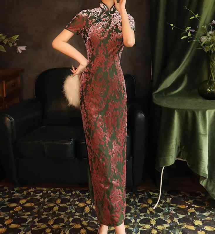 レディース チャイナドレス ロング ベルベット 半袖 薄ピンク 緑 花柄 フローラル 立ち襟 斜めラベル ハイスリット 光沢 フェミニン モダン スタイリッシュ エレガント 優雅
