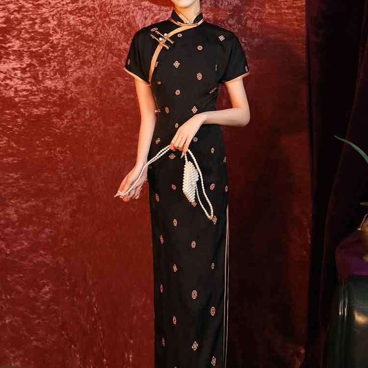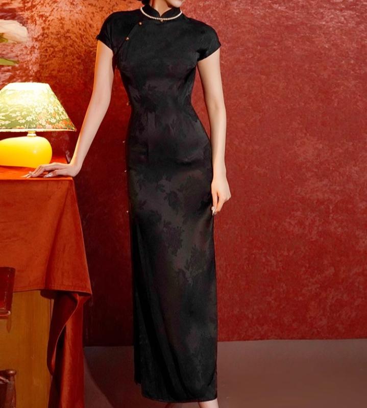 レディース チャイナドレス ロング 半袖 黒 高級感 セレブ風 ジャカード フローラル レトロ クラシック モダン フォーマル 立ち襟 斜めラベル ハイスリット エレガント