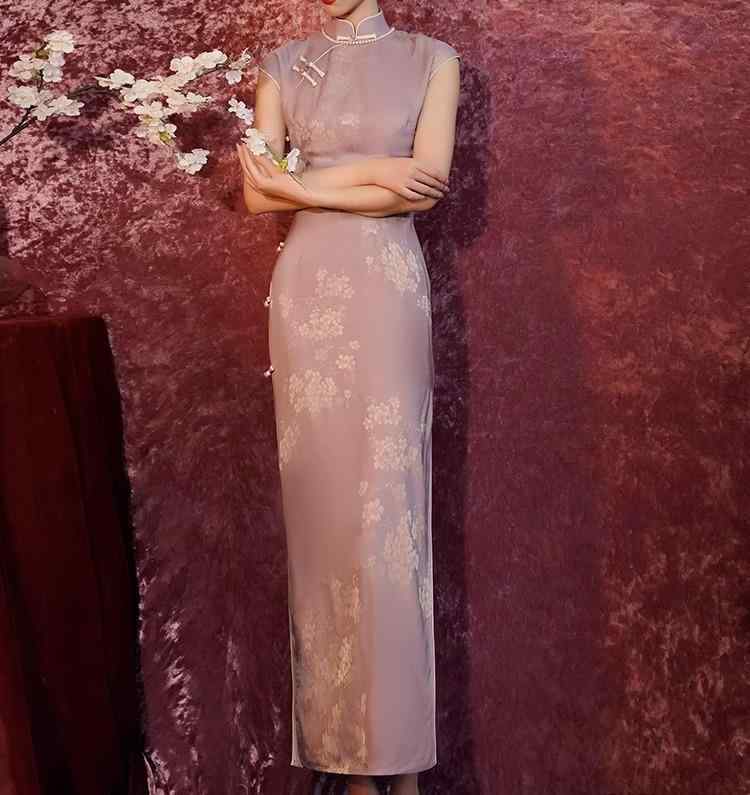 レディース チャイナドレス ロング 薄ピンク紫 桜 ジャカード 立ち襟 斜めラベル ハイスリット シック レトロ 古風 エレガント 上品 フェミニン モダン中華 高級感 きれいめ