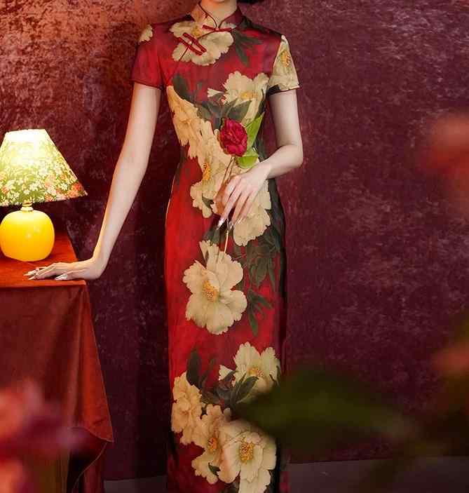 レディース チャイナドレス 半袖 ロング 赤 牡丹 椿 大柄 モダン中華 立ち襟 斜めラベル ハイスリット エレガント 伝統美 優雅 華やか レトロ セレモニー パーティー