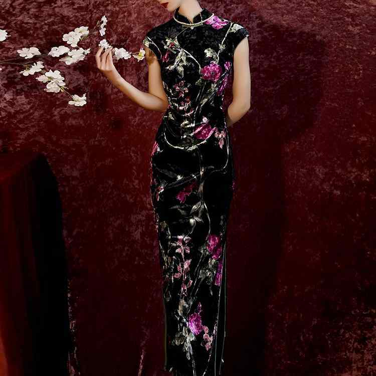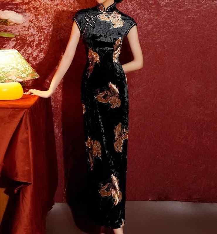 レディース チャイナドレス ロング 黒 ベルベット 花 白 赤 カラフル 華やか 花レース 立ち襟 斜めラベル ハイスリット モダン中華 優雅 クラシック レトロ 上品 シルキー