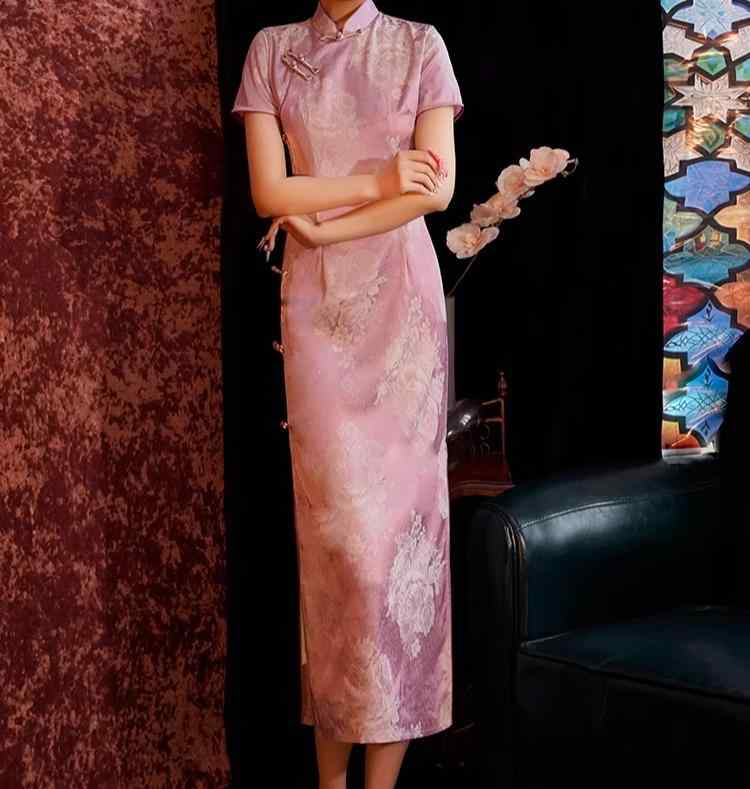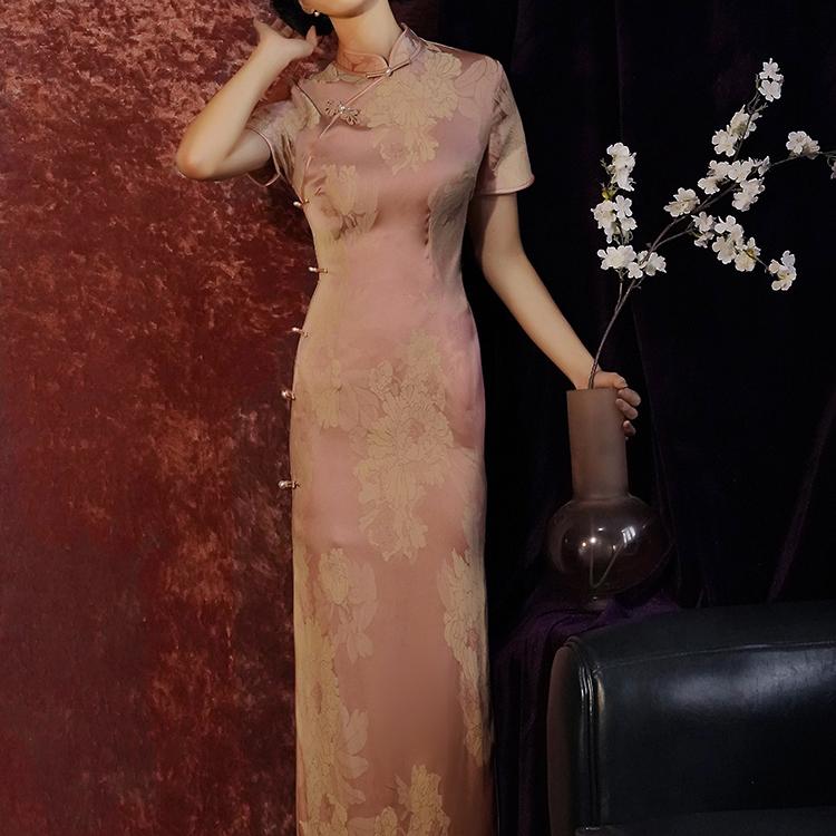 レディース チャイナドレス ロング 半袖 ピンク 薄紫 ジャカード 花柄 フローラル フェミニン 上品 立ち襟 斜めラベル パイピング ハイスリット 優雅 高級 華やか エレガント