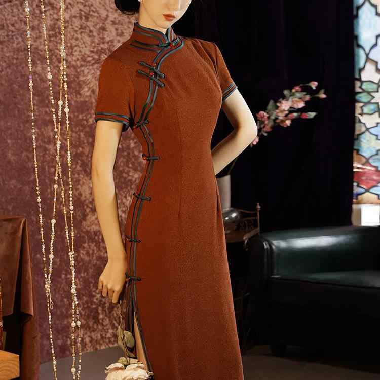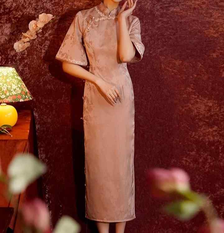 レディース チャイナドレス ロング 半袖 ミドル丈 茶 紫 ジャカード 花 フローラル シック 立ち襟 斜めラベル パイピング ハイスリット 優美 中華伝統 優雅 セレモニー