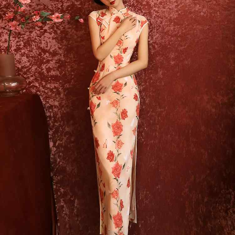 レディース チャイナドレス ロング アイボリー 薔薇 ローズ オレンジ フローラル 斜めラベル 立ち襟 中華スタイル フェミニン エレガント 優雅 高級感 モダン 若々しい
