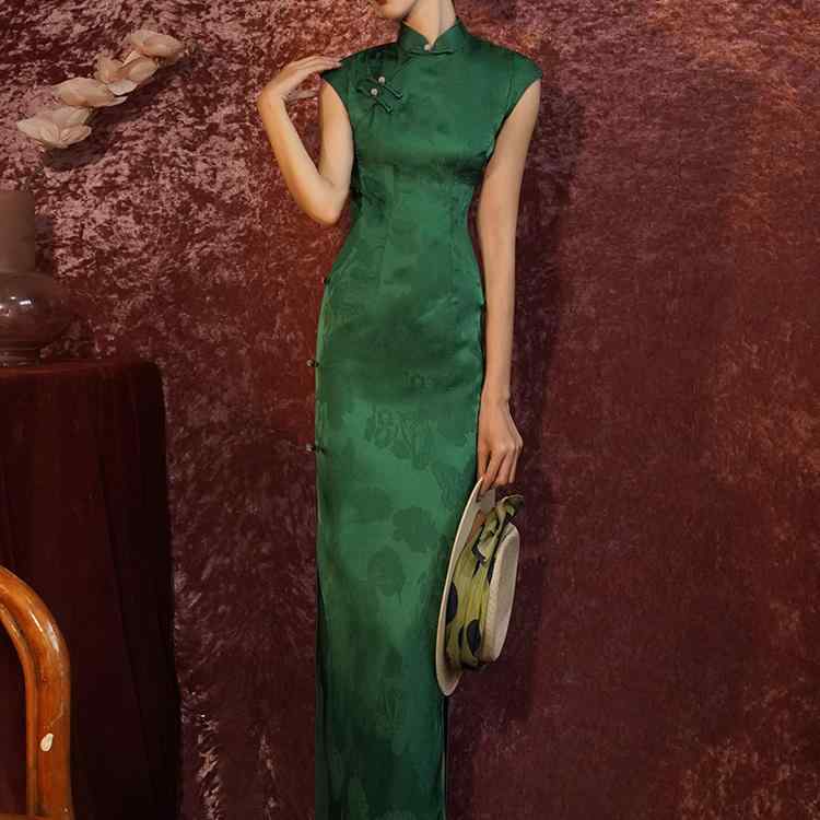 レディース チャイナドレス ロング 緑 グリーン 黄色 ハイスリット 立ち襟 斜めラベル 中華スタイル ジャカード 植物柄 レトロ クラシック エレガント 優雅 スリム