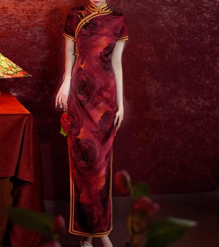 レディース チャイナドレス 半袖 ロング ワインレッド セレブ風 薔薇 ローズ柄 カラーブロック 立ち襟 斜めラベル ハイスリット 華やか エレガント スタイリッシュ 高級感