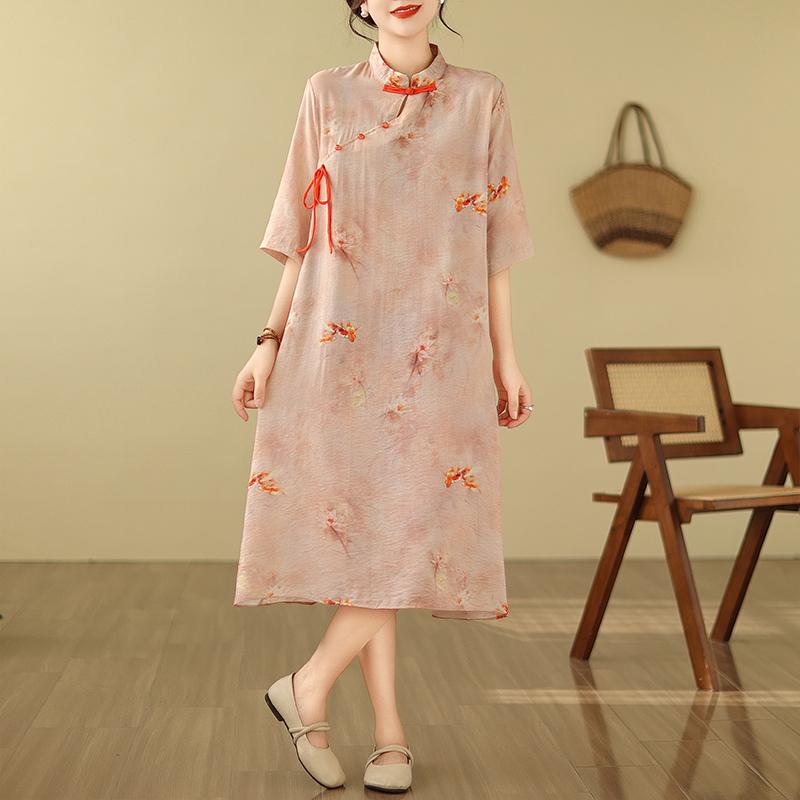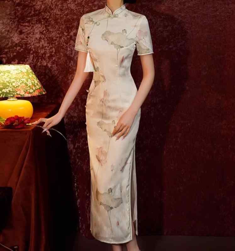 レディース チャイナドレス ロング 半袖 薄ベージュ 蓮 花柄 中華伝統 立ち襟 斜めラベル ハイスリット 優雅 アジアン モダン 優美 レトロ クラシック