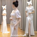 イブニングドレス マーメイドドレス スリット 白 サテンドレス Vネック セクシー ロングドレス パフスリーブ 発表会ドレス ホワイト マーメイドライン 結婚式ドレス 二次会ドレス ワイン赤 ベロア ベルベット オシャレ 送料無料
