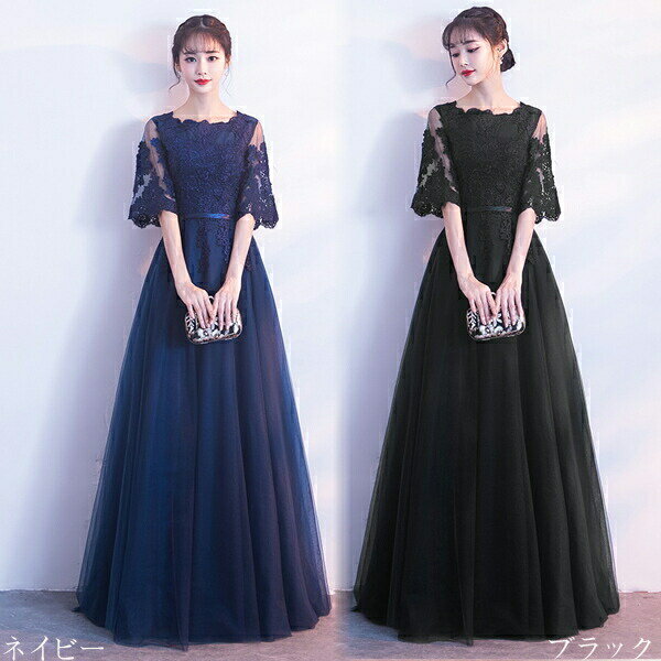 ドレス ワンピース 通販 パーティードレス フォーマルドレス 袖あり 七分袖 膝下丈 ミモレ丈 ウエストリボン レース フレア ロングドレス フォーマル 結婚式 発表会 演奏会 披露宴 パーティー レディース 大人 上品 おしゃれ オシャレ かわいい カワイイ