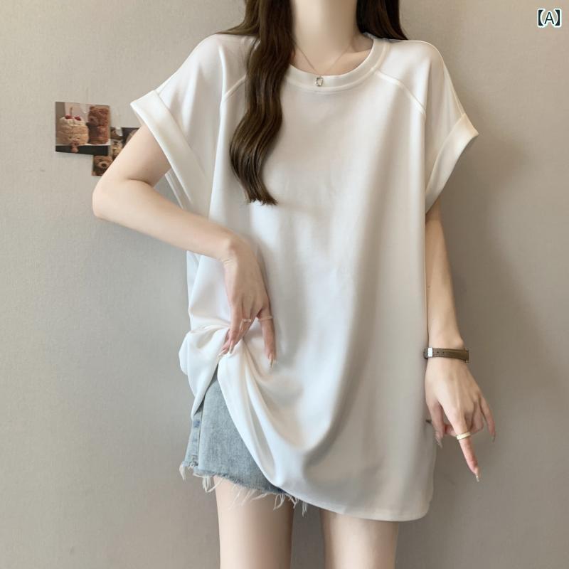 Tシャツ 半袖 大きいサイズ ゆったり カジュアル ミドル 丈 ヒップ カバー 半袖 Tシャツ レディース 夏 mm シンプル 無地 バー ジョン トップス