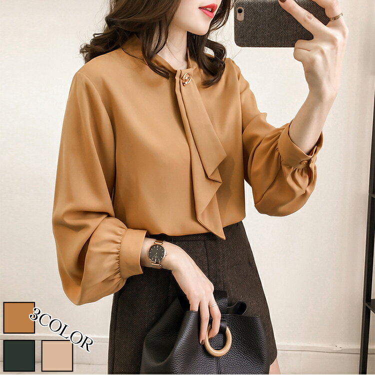 ボウタイブラウス トップス シャツ レディース 長袖 ボリューム袖 春 秋 冬 スカーフタイブラウス トップス シャツ ゆったり 大きいサイズ 大人可愛い きれいめ オフィス 通勤 カジュアル 体形カバー 無地 送料無料
