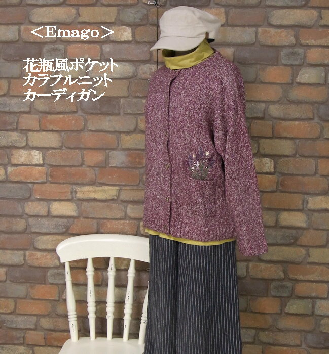 『Emago』花瓶風ポケット〜やや厚カラフルニット長袖花柄カーディガン(パープル)(秋・冬・春) レディース トップス 女性 長袖 アウター 前開き ミックスニット マルチカラー 紫 綿 ポリエステル アクリル ナイロン 大人 ナチュラル カジュアル【Emago(イマゴ)】 イマゴ