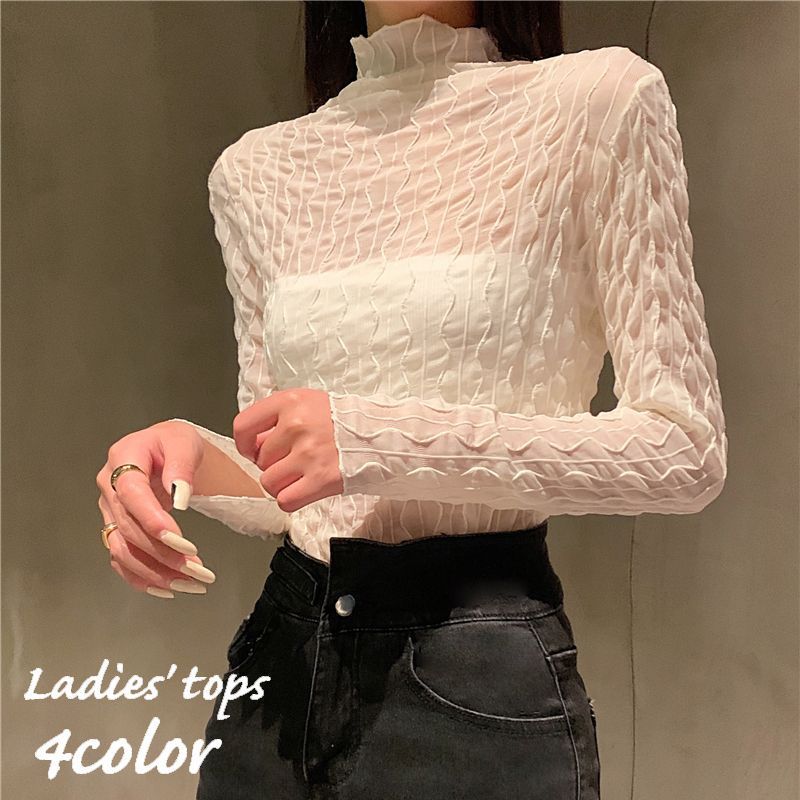 送料無料 ブラウス レディース 女性用 トップス 長袖 ハイネック 透け感 ライン ウェーブ タイト おしゃれ 可愛い シンプル おでかけ 普段使い 婦人用 春 秋 ブラック ホワイト ベージュ ブラウン