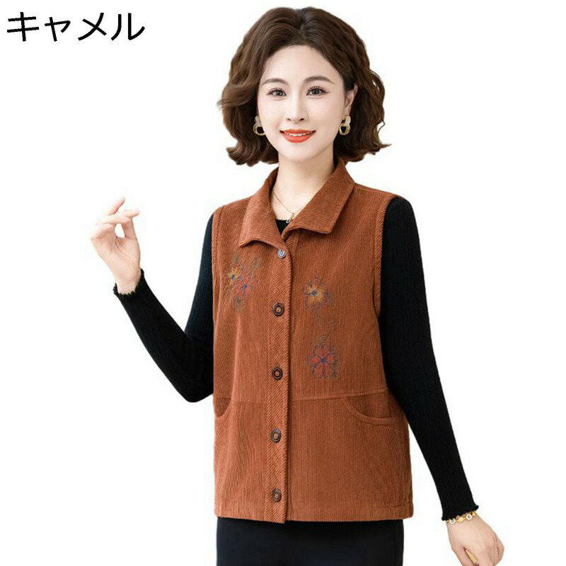 カジュアルベスト カーゴベスト 高齢者 レディース ヴィンテージ 花柄 コーデュロイ素材 前開き 袖なしカーディガン 秋冬 シニア女性 婦人服 サイドポケット付き 自宅 通勤通学 日常着 室外