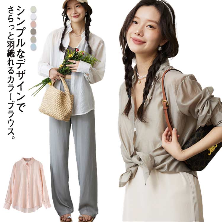 長袖 送料無料 シルク調 トップス 襟付き ブラウス 透け感 春夏 レディース ブラウス 羽織り 夏 自宅用 トップス 長袖シャツ エアコン対策 日焼け防止 暑さ対策 オフィス ゆったり アウトドア シャツ