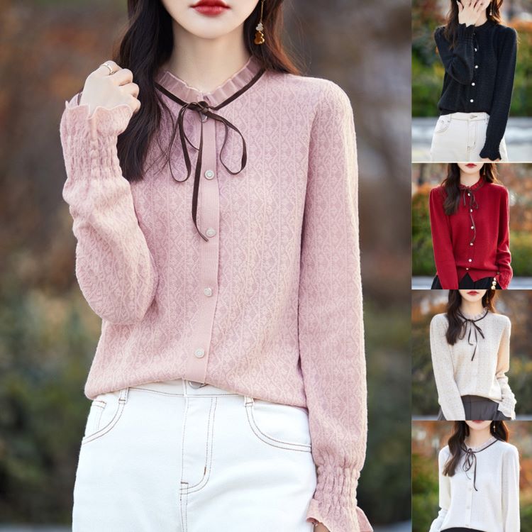 暖かくて肌触 ウール ご自宅で洗える 無地ニット レディース ニット ウール レディース カーディガン リボン ウールカーディガン