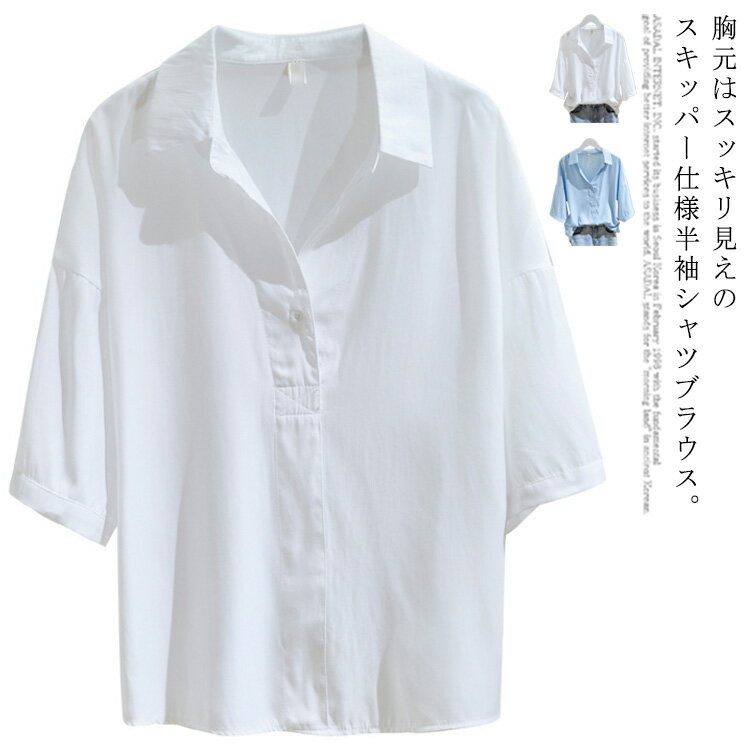 送料無料 ブラウス レディース 半袖 襟付き スキッパーシャツ とろみシャツ Vネック トップス シャツブラウス 角襟 オフィス 通勤 通学 春 夏 おしゃれ 無地 ルーズ ゆったり フォーマル 大人 体型カバー エレガント お洒落 キレイめ