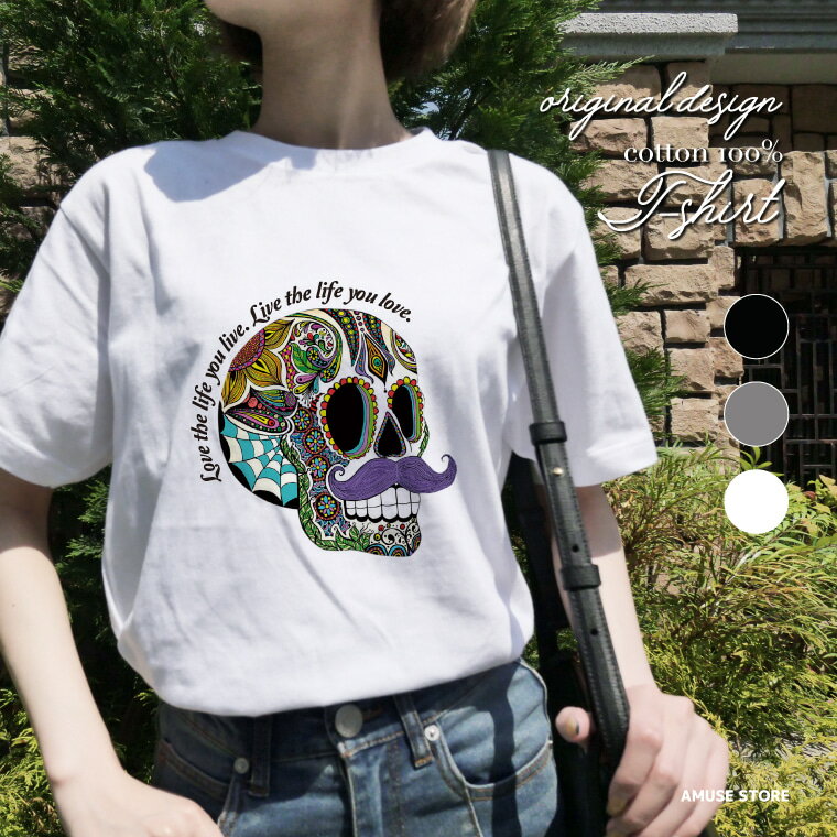 Tシャツ レディース 半袖 おしゃれ プリント ブラック ホワイト クルーネック 綿100% カジュアル レディースファッション 5.6オンス プリントtシャツ スカル ガイコツ ボタニカル