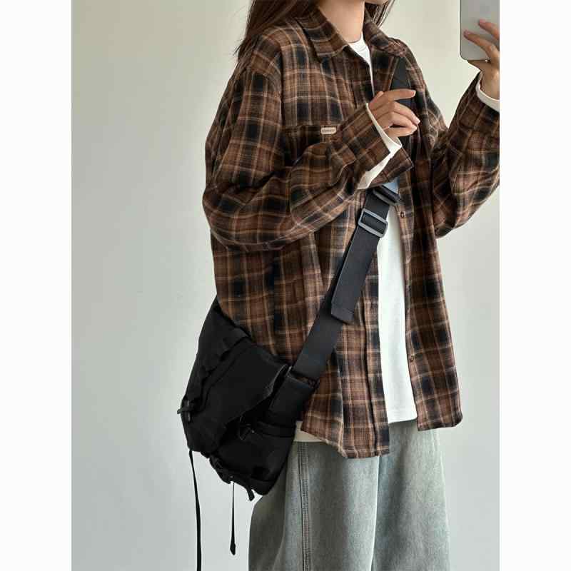 シャツ メンズ レディース レトロ カジュアル チェック柄 起毛 コットン 綿 ビスコース ゆったり ルーズ オーバーサイズ シティボーイ 着回し 長袖 アウター トップス 春秋 ブラウン系