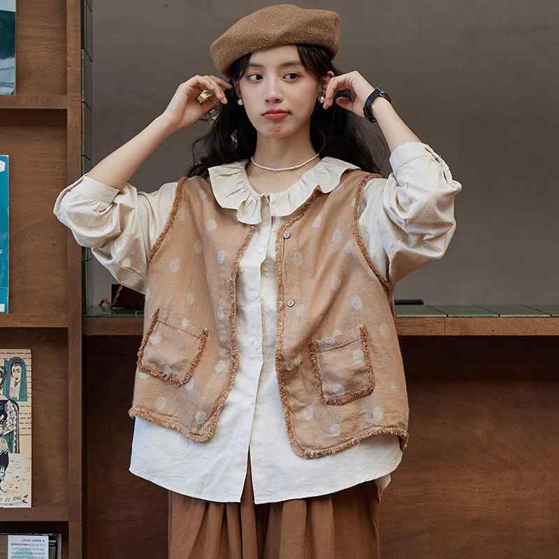 ベスト レディース 秋冬 日系 レトロ 森ガール風 ドット柄 Vネック フリンジ ポケット レイヤード ゆったり ルーズフィット 綿麻 カーキ 前開き