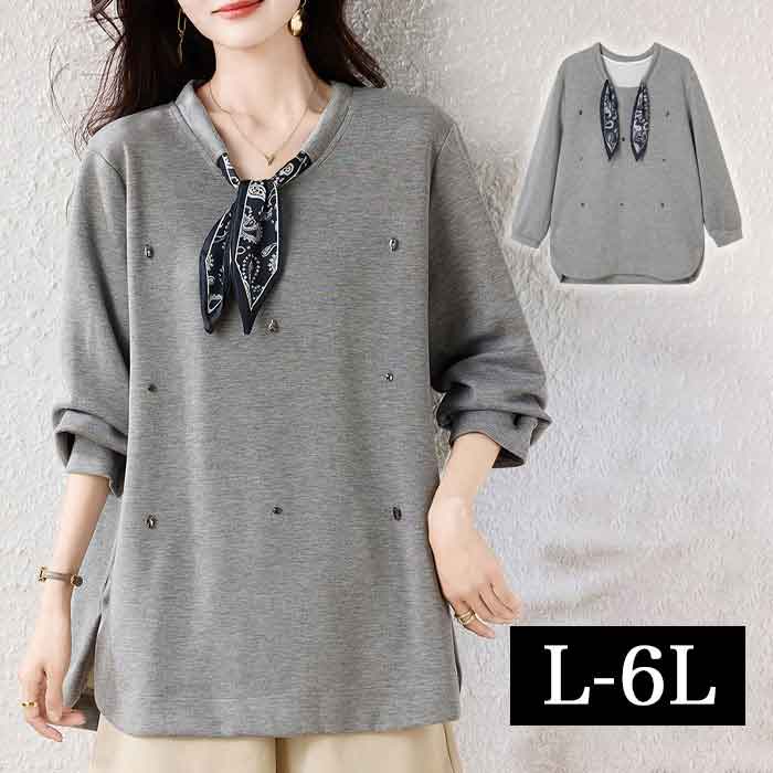 \全品送料無料11/27まで / L-6L バンダナ スカーフ ビジュー 長袖トップス ロング トップス カットソー スエット スウェット チュニック 大きいサイズ レディース 可愛い ロング丈 秋冬 秋 春 ブラックフライデー