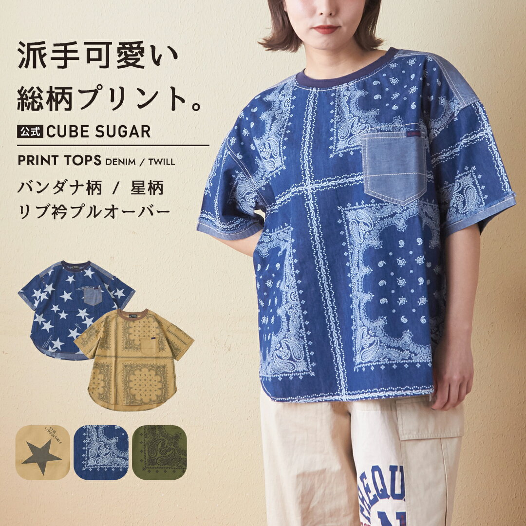 【31%OFF】Tブラウス / 公式 CUBE SUGAR 総柄 プリント リブ衿 ( 4.5オンス デニム / ツイル )(5色): アメカジ レディース トップス Tシャツ 星柄 バンダナ柄 ペイズリー 半袖 カジュアル キューブシュガー