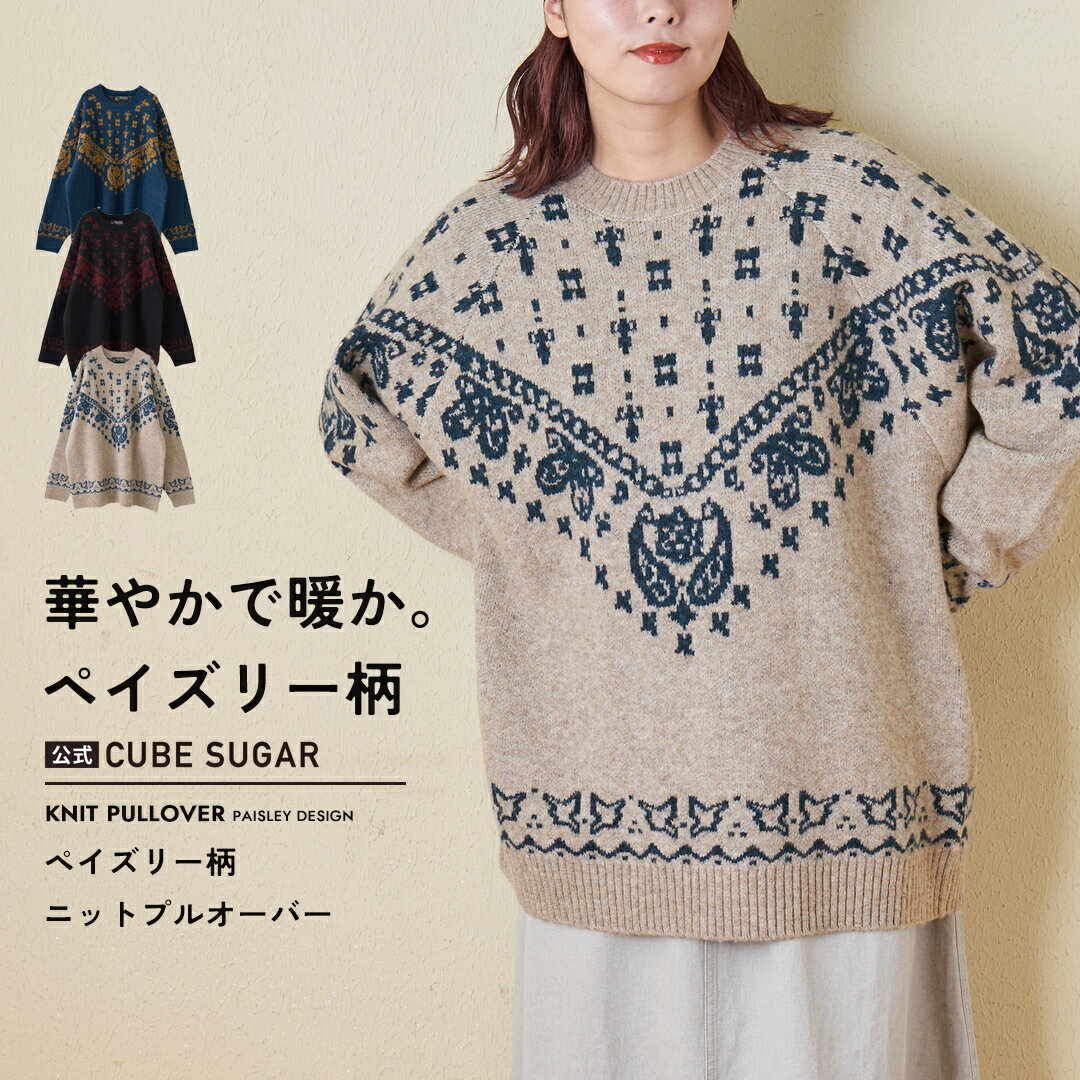 【ブラックフライデー★13%OFF】【秋冬新作】ニット / 公式 CUBE SUGAR リサイクル ニット ペイズリー柄 ジャガード プルオーバー (3色): アメカジ レディース トップス セーター バンダナ ペーズリー カジュアル ナチュラル キューブシュガー