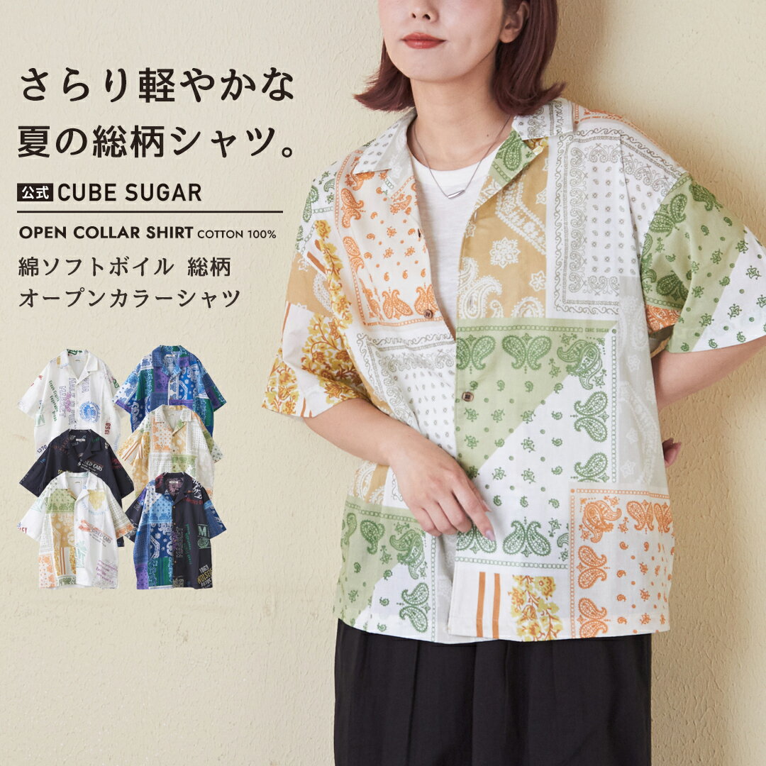 【31%OFF】総柄シャツ / 公式 CUBE SUGAR 綿 ソフトボイル 総柄 プリント オープンカラー シャツ (6色): アメカジ レディース トップス シャツ ブラウス 前開き 羽織り 半袖 無地 バンダナ ペイズリー カジュアル キューブシュガー