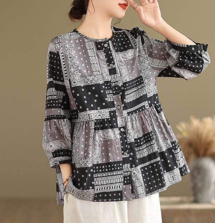 予約商品 大きいサイズ レディース トップス 総柄 ペイズリー柄 バンダナ柄 ペプラムシルエット シャツ 7分袖 パフスリーブ トップス ノーカラー シャツ M L LL 3L 4L レディース 大人 30代 40代 50代