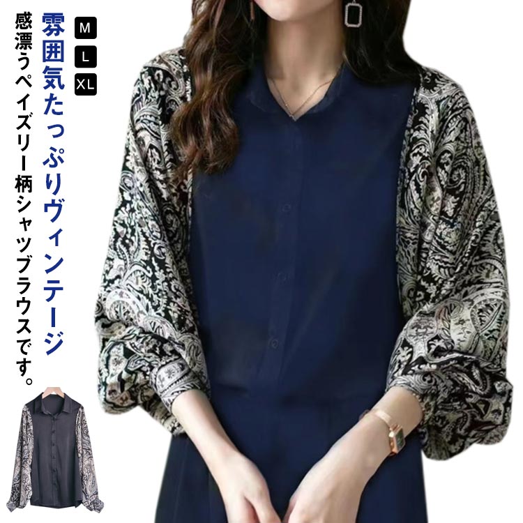 雰囲気たっぷりヴィンテージ感漂うペイズリー柄シャツブラウスです。ふんわりバルーン袖がおしゃれ。肌触りの良いシフォン素材が高級感を醸し出す。ハリ感が程よく大人の上品さもプラス!一枚で着てもボタンを開けて羽織としても着回し抜群。スタイリングしやすくトレンド感のあるデザインが魅力の一枚です。パンツにもスカートにも、綺麗めにもカジュアルにも合わせやすい! サイズM L XLサイズについての説明M:肩幅39cm 袖丈63cm バスト102cm 着丈69cm/ L:肩幅40cm 袖丈64cm バスト106cm 着丈70cm/ XL:肩幅41cm 袖丈65cm バスト110cm 着丈71cm/ ※サイズ表の実寸法は商品によって1-3cm程度の誤差がある場合がございます。素材ポリエステル色ブラック ネイビー備考 ●サイズ詳細等の測り方はスタッフ間で統一、徹底はしておりますが、実寸は商品によって若干の誤差(1cm〜3cm )がある場合がございますので、予めご了承ください。 ●商品の色は、撮影時の光や、お客様のモニターの色具合などにより、実際の商品と異なる場合がございます。あらかじめ、ご了承ください。●製品によっては、生地の特性上、洗濯時に縮む場合がございますので洗濯時はご注意下さいませ。▼色味の強い製品によっては他の衣類などに色移りする場合もございますので、速やかに(脱水、乾燥等)するようにお願いいたします。 ▼生地によっては摩擦や汗、雨などで濡れた時は、他の製品に移染する恐れがございますので、着用の際はご注意下さい。▼生地の特性上、やや匂いが強く感じられるものもございます。数日のご使用や陰干しなどで気になる匂いはほとんど感じられなくなります。