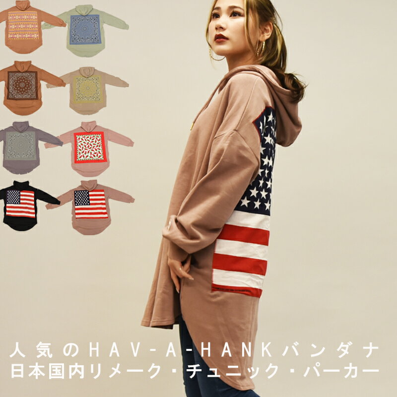【期間限定1000円クーポン&P2倍】【楽天ランキング2位】HAVAHANKバンダナ総刺繍ワッペン裏毛リメイク長袖チュニック丈裏毛パーカーコットン100%トップス TOPS レディース 綿100% ゆったり 大人かわいい おしゃれ フリー F 無地 古着テイスト 古着風