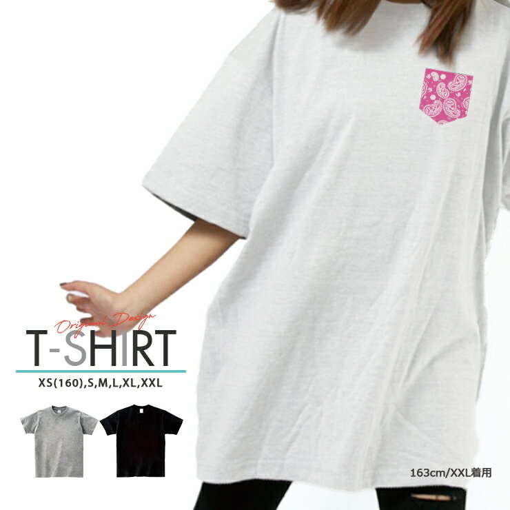 Tシャツ レディース メンズ クルーネック 丸首 綿 半袖 カットソー 大人かわいい オシャレ かっこいい ペア カップル おそろ リンクコーデ バンダナ ペイズリー柄 模様 デザイン シンプル ワンポイント ポケット 風 ピンク
