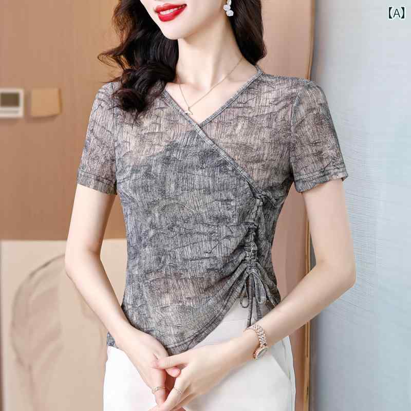 レディース T シャツ 半袖 夏 トップス 絞り染めプリント メッシュ Vネック シースルー 透け感 クロス エレガント フロント クール セクシー ウエストシェイプ