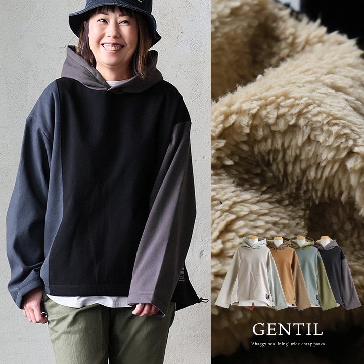 パーカー 長袖 レディース 無地 配色 クレイジー 裏地付き シャギーボア 暖かい 軽い 保温性 綿100 コットン ポリエステル 裾ロックコード 重ね着 大きいサイズ 体型カバー カジュアル 秋 冬 パティ GENTIL ジャンティ