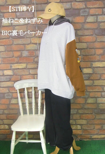 『STIPPY』袖ねこ&ねずみ刺繍カジュアル裏毛長袖BIGパーカー(クレイジー(ブラウン/グリーン/杢グレー))(秋・冬・春) レディース トップス プルオーバー 女性 長袖 ねこ 猫 ネコ キャット 動物 アニマル 厚手 カジュアル ゆったり【STIPPY(スティッピー)】
