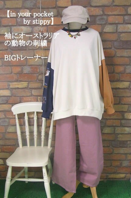 『in your pocket by stippy』オーストラリア刺繍の袖動物刺繍&背中に国旗カジュアル裏毛長袖トレーナー(クレイジー/ブラウン・ネイビー・ アイボリー)(秋・冬・春)レディース トップス 女性 長袖 プルオーバー ゆったり 茶 紺 【STIPPY(スティッピー)】