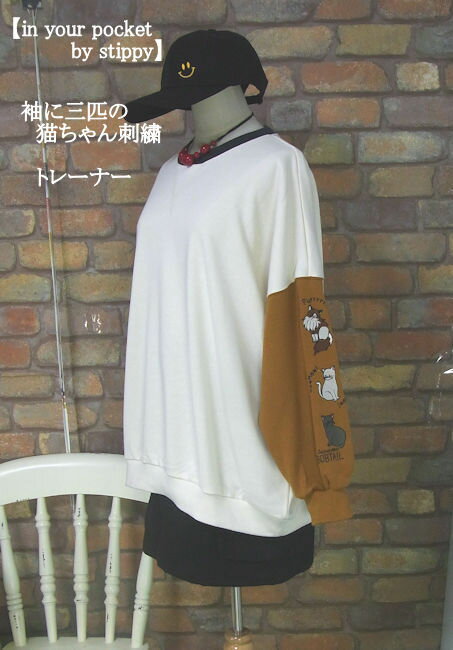 『in your pocket by stippy』袖ねこ刺繍カジュアル裏毛長袖BIGトレーナー(クレイジー)(秋・冬・春) レディース トップス 女性 長袖 ねこ 猫 ネコ キャット 動物 アニマル プルオーバー 厚手 黒 ゆったり カジュアル ガゼット付き【STIPPY(スティッピー)】