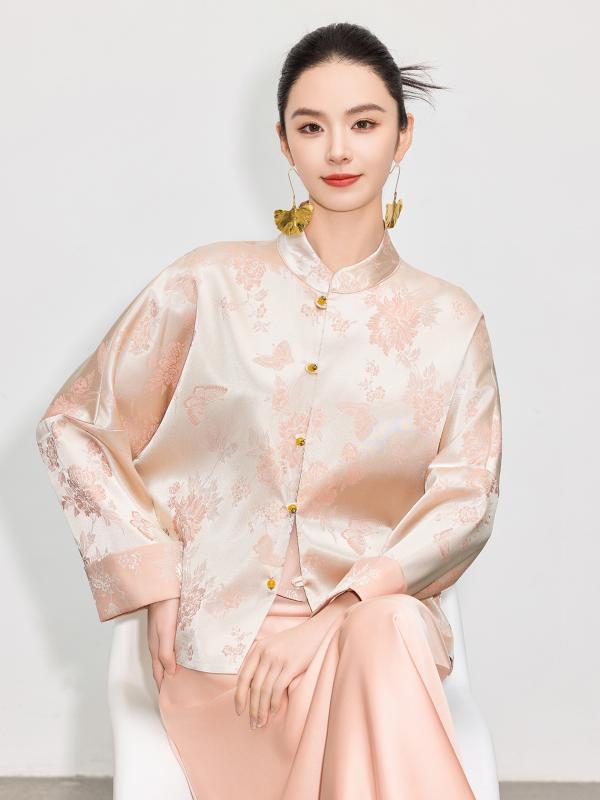 ジャケット レディース 春夏 新中式 スタンドカラー 高級感 ジャカード織り ポリエステル サテン調 光沢 長袖 ピンク 普段使い オフィス お出かけ