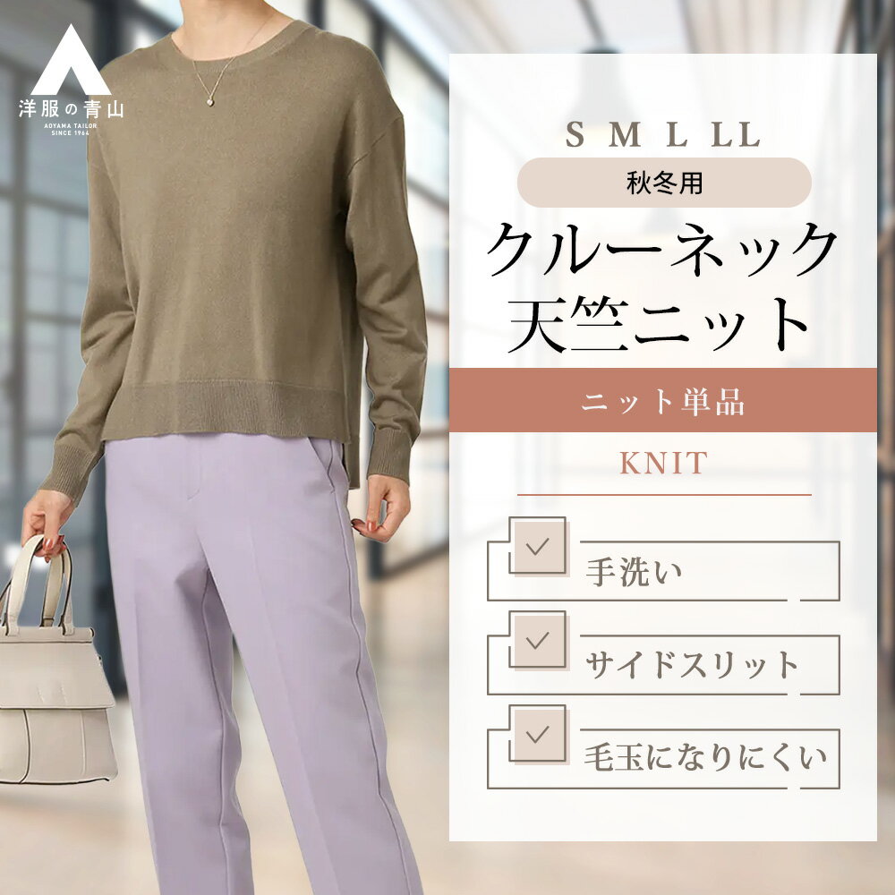【洋服の青山】 クルーネックニットプルオーバー レディース 長袖 秋冬用 ベージュ系 無地 ハンドウォッシュ 手洗い 毛玉抑制 ミニマル 天竺編み サイドスリット ビジネス カジュアル ビジカジ シンプル きれいめ かわいい おしゃれ ANCHOR WOMAN