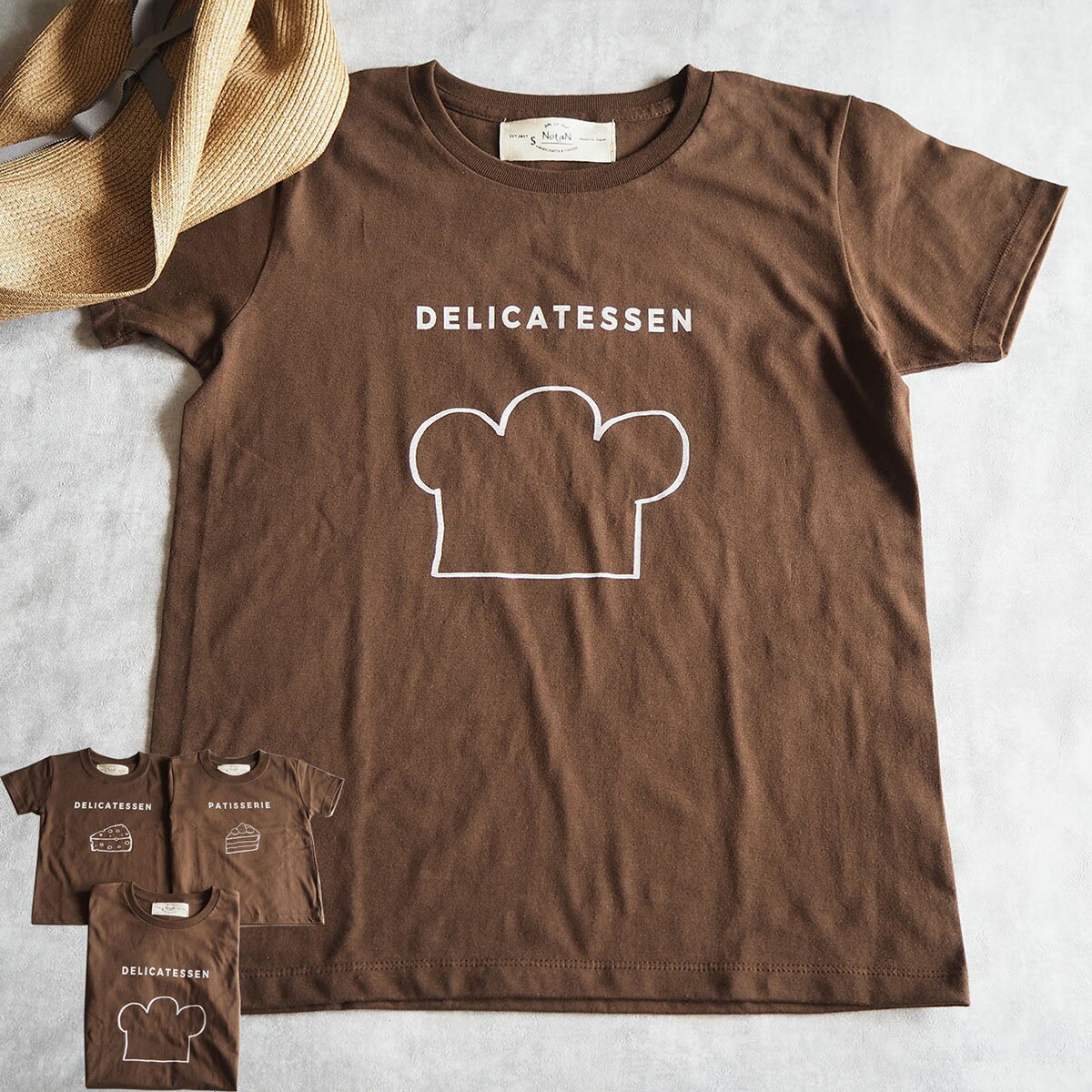 エプロンTシャツ ブラウン 【大人】 womens S~L, mens S~XLシンプル レディース メンズ プレゼント お揃い 親子お揃い 家族お揃い リンクコーデ シンプル ロゴ ケーキ チーズ コックさん コック帽 ケーキ屋さん デリカテッセン パティスリー