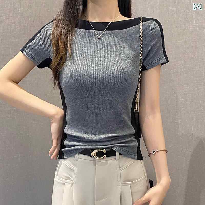 シャツ ブラウス ワンピ Aライン ねじの 一 字の 襟の 色 合わせの 半袖の t シャツ レディース 春夏 2025年の 新型の 修身の 底の シャツ中は やせている 上着を 現します。