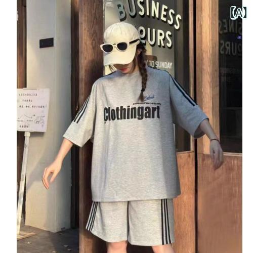 夏 セットアップ レディース スポーティ カジュアル おしゃれ カレッジ 半袖 ゆる Tシャツ ショーパン ルーズ ランニング ウェア 女性 ビッグシルエット